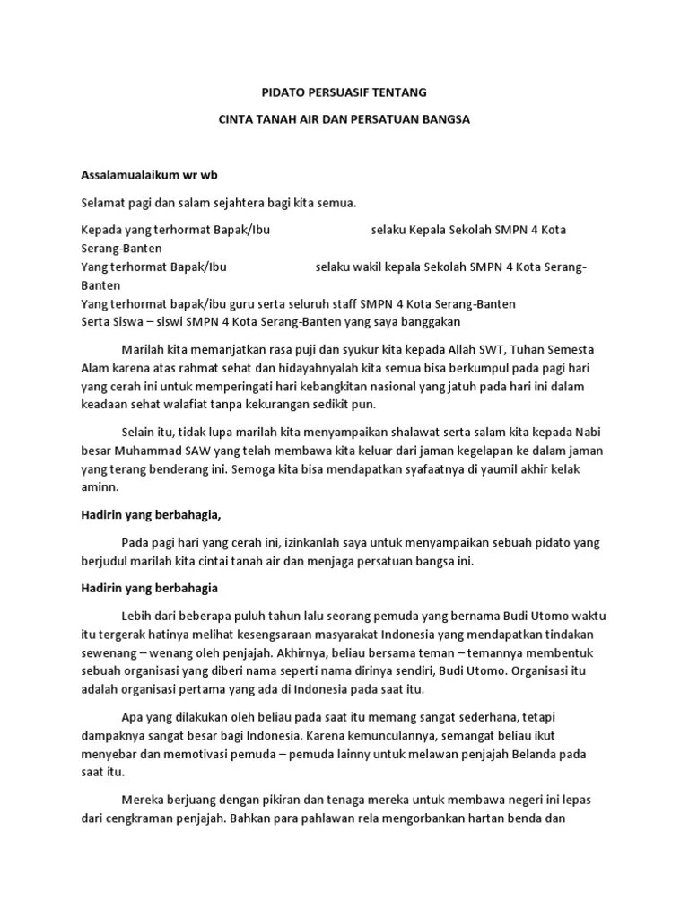 Diantara mereka yang hadir adalah: . Dalam islam kita diajarkan juga untuk mencintai tanah air. Terima kasih atas kesempatan yang telah diberikan, sehingga saya dapat berpidato dengan hal yang . Mengapa kita harus mencintai indonesia? Cinta tanah air dan patriotisme.